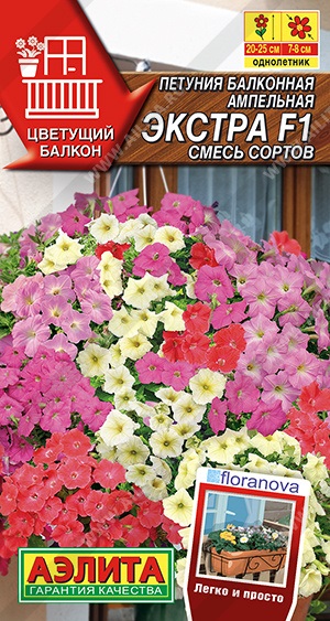 Смесь многоцветковых гибридов от английской компании Floranova. Растения высотой 20-25 см, формируют красивые аккуратные побеги длиной до 60 см, которые полностью усыпаны цветками Ø 7-8 см. Гибриды характеризуются насыщенной окраской и обильным цветением в течение всего сезона. Наилучшим образом подходит для подвесных кашпо, вазонов и балконных ящиков. При высадке в клумбы и цветники растение плотно и красиво укрывает почву.
