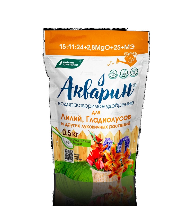 Акварин для лилий, гладиолусов и других луковичных растений - водорастворимое удобрение, в состав которого входит азот, фосфор, калий, магний, сера и микроэлементы – железо, цинк, марганец, медь в хелатной форме, а бор и молибден – в минеральной. Благодаря кислой реакции (рН) удобрения, оно легко растворяется в холодной воде и более эффективно усваивается корневой системой или листовой поверхностью растений. Состав N (%): 15 P2O5 (%): 11 K2O (%): 24 MgO (%): 2.8 S (%): 2