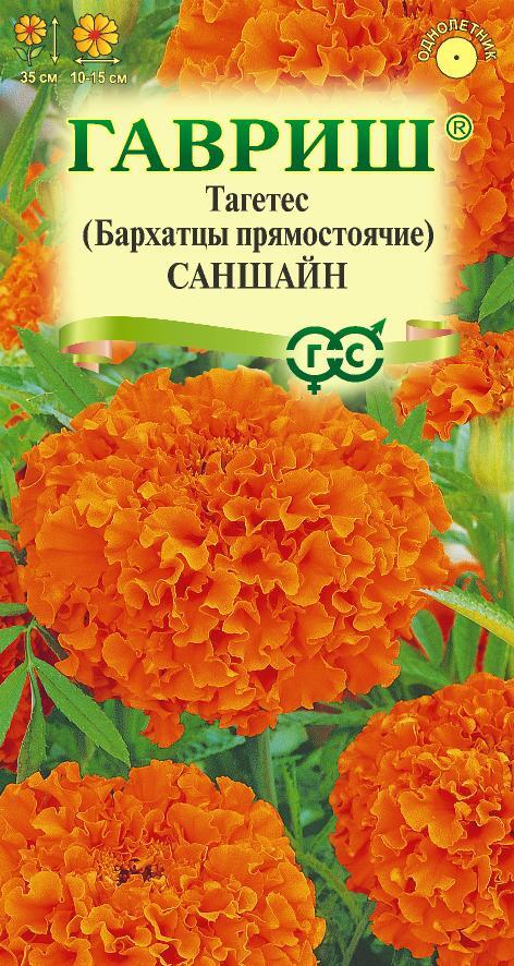 Однолетнее растение семейства Сложноцветные. Стебли прямостоячие, 35 см высотой. Соцветия-корзинки до 10-15 см в диаметре, темно-оранжевой окраски. В открытый грунт высевают в конце мая – начале июня. Всходы появляются на 5-10 день. Почву желательно накрыть нетканым материалом (акрил, лутрасил). В этом случае сеять можно на неделю-полторы раньше обычных сроков и тем самым ускорить цветение. На рассаду сеют в конце марта – начале апреля. Цветение начнется в июне. Бархатцы, высаженные рядом с огородными культурами уменьшают их поражение грибными заболеваниями, особенно фузариозом, защищают от некоторых видов нематод. Бархатцы используют во всех видах цветников. Они хорошо растут в горшках, вазонах, балконных ящиках, в сочетании с примулами и цинерариями.