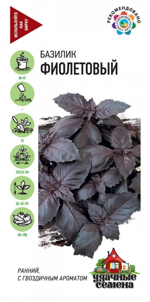 Среднеспелый (60-70 дней) сорт. Растение прямостоячее, высотой до 60 см, полураскидистое. Листья крупные, удлиненно-яйцевидные, с зубчатым краем, темно-фиолетовые. Аромат сильный, пряный. Базилик предпочитает хорошо структурированные, богатые гумусом почвы. Выращивается рассадным способом. Нуждается в регулярных поливах. Используется в свежем виде в качестве салатной зелени и пряно вкусовой добавки, а также натурального ароматизатора в кулинарии и при консервировании.