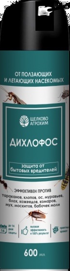 «Дихлофос» – аэрозоль для уничтожения всех ползающих и летающих вредных насекомых. Это контактный инсектицид и акарицид широкого спектра, который отличается высокой токсичностью. Поэтому средство высокоэффективно и дает 100 %-й результат. «Дихлофос» не содержит хладонов и озоноразрушающих веществ. Для удобства использования в труднодоступных местах оснащен распыляющей головкой с трубкой. ДВ : Циперметрин 0,2%, тетраметрин 0,15%, синергист, отдушка, углеводородный пропеллент, растворитель