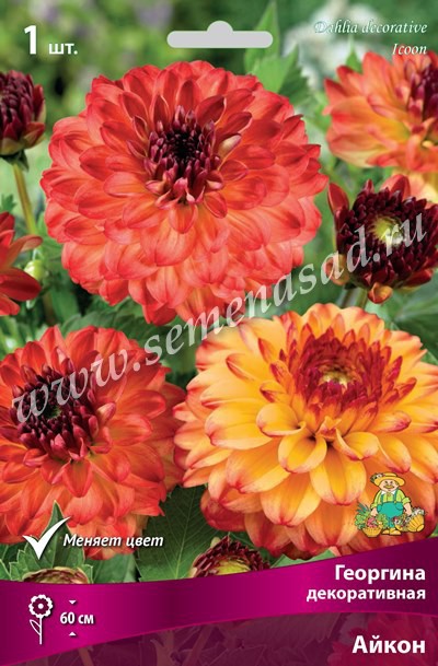 Георгина – популярное садовое растение с крупными перистыми листьями и оригинальными соцветиями-корзинками. Растения высотой 40-120 см, обильно ветвятся, формируя пышные кусты с обилием цветоносов. Корзинки немахровые и полумахровые, окраска язычковых цветков самая разнообразная, ярких и пастельных тонов, контрастная и меланжевая. Айкон - высота растения 60 см. Эффектный ХАМЕЛЕОН! В процессе цветения меняет окрас от желтого с красными кончиками до красно-розового с желтым основанием, диаметр цветка 10 см, цветет обильно и продолжительно.