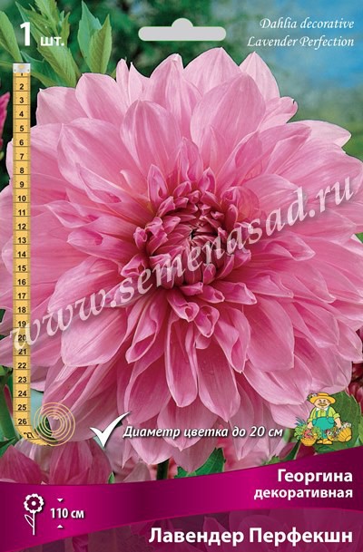 Георгина – популярное садовое растение с крупными перистыми листьями и оригинальными соцветиями-корзинками. Растения высотой 40-120 см, обильно ветвятся, формируя пышные кусты с обилием цветоносов. Корзинки немахровые и полумахровые, окраска язычковых цветков самая разнообразная, ярких и пастельных тонов, контрастная и меланжевая. Лавендер Перфекшн - высота растения 110 см. Цветок диаметром 20 см, розово-лиловый.
