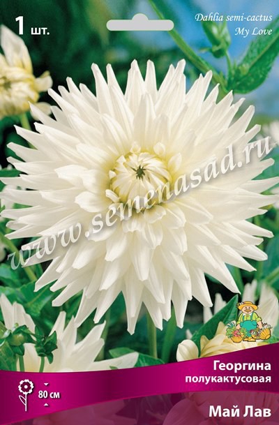 Георгина – популярное садовое растение с крупными перистыми листьями и оригинальными соцветиями-корзинками. Растения высотой 40-120 см, обильно ветвятся, формируя пышные кусты с обилием цветоносов. Корзинки немахровые и полумахровые, окраска язычковых цветков самая разнообразная, ярких и пастельных тонов, контрастная и меланжевая. Май Лав - высота растения 80 см. Цветок диаметром 15 см, белой окраски.