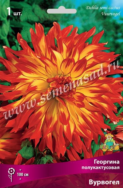 Георгина – популярное садовое растение с крупными перистыми листьями и оригинальными соцветиями-корзинками. Растения высотой 40-120 см, обильно ветвятся, формируя пышные кусты с обилием цветоносов. Корзинки немахровые и полумахровые, окраска язычковых цветков самая разнообразная, ярких и пастельных тонов, контрастная и меланжевая. Вурвогел - высота растения 100 см. Цветок диаметром 15 см, желтый, с ярко-красными кончиками, лепестки волнистые.
