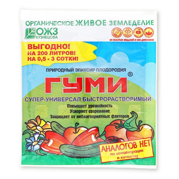 Мощный природный антистрессовый препарат, помогает при засухе, заморозках, похолодании, при посадке, пересадке и других неблагоприятных условиях роста. Природное биоактивированное по микроэлементному и молекулярному составу гумусное вещество. Состав : Гуматы натрия не менее 60%, макроэлементы и микроэлементы природного происхождения.