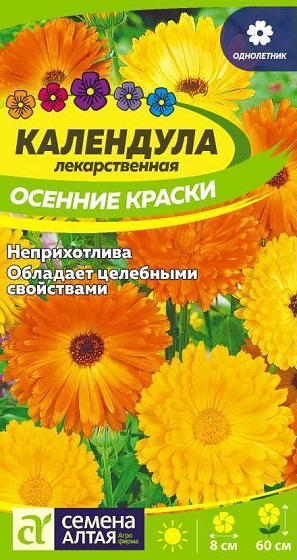Яркоцветущая смесь высокорослых сортов календулы с замечательным сочетанием ценных характеристик: высокие декоративные качества, целебные свойства, продолжительный период цветения. Неприхотливость и холодостойкость позволяют выращивать календулу повсеместно. Растение кустовой формы ветвистое высотой до 60 см с прямостоячими побегами, увенчанными множеством соцветий солнечных теплых тонов: желтого, оранжевого, палевого, янтарного. Соцветия крупные, диаметром до 8 см, обладают специфическим освежающим ароматом. Великолепно смотрится в одиночных и групповых посадках на газонах, клумбах, в бордюрах, лекарственных садиках. Долго сохраняет свежесть и декоративность в срезке. Светолюбивое, холодостойкое и довольно неприхотливое растение. Выносит заморозки до -5ºС.