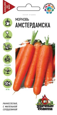 Раннеспелый (80 дней от всходов до технической спелости) сорт. Корнеплод цилиндрический с тупым кончиком, выравненный, длиной 14-16 см, массой 53-154 г. Сердцевина маленькая, оранжевая, мякоть нежная, сочная, отличного вкуса. Корнеплод почти полностью погружен в почву. Ценность сорта: высокая урожайность, устойчивость к растрескиванию и цветушности. Сорт универсального назначения, используется для сбора пучками, хранения, прекрасно подходит для домашней кулинарии. Урожайность 3-5 кг/м2. Посев в грунт производят в конце апреля – начале мая на глубину 1 см, расстояние между рядками 18-20 см. Подросшие всходы прореживают, оставляя между растениями по 3-5 см.