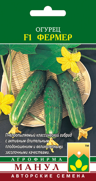 F1 Фермер - классический пчелоопыляемый гибрид преимущественно женского или женского типа цветения. Предназначен для открытого грунта, весенних теплиц, тоннелей. Ветвление среднее или выше среднего. В узлах формируется по 1-2 завязи. Зеленцы крупнобугорчатые, белошипые, длиной 10-12 см, плотные, хрустящие; засолочные и консервные качества очень высокие. Интенсивный рост растений, мощная корневая система, активное отрастание боковых побегов в сочетании с холодостойкостью и комплексной устойчивостью к болезням обусловливают продолжительное дружное плодоношение до осенних заморозков. Гибрид устойчив к мучнистой росе, оливковой пятнистости, вирусу обыкновенной огуречной мозаики, толерантен к ложной мучнистой росе. В посадки F1 Фермер добавляют 10 % опылителя.