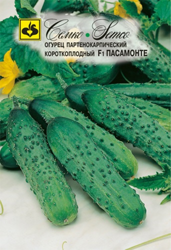 Огурец Пасамонте F1 - ранний партенокарпический гибрид с пучковым плодоношением. От всходов до начала плодоношения 43–45 дней. Плод генетически без горечи, цилиндрический, длиной 6–9 см, крупнобугорчатый, белошипый, зеленый с продольными полосами средней длины и средневыраженной пятнистостью, не перерастает. В одном узле формирует 2–3 плода. Вкусовые качества свежих и консервированных плодов отличные. Пригоден для засола и консервирования. Огурец Пасамонте F1 устойчив к кладоспориозу и мучнистой росе, относительно устойчив к вирусу огуречной мозаики-1. Урожайность 12–15 кг/м2.