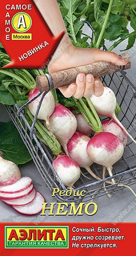 Скороспелый сорт. Устойчивый к стрелкованию растений и дряблению корнеплодов. Подходит для получения пучковой продукции. Розетка листьев прямостоячая, компактная. Корнеплоды двухцветные, округлые, ровные, массой 22-25 г. При сборе урожая через 28-30 дней после появления всходов белый цвет преобладает в их окраске, а спустя 35-40 дней – красный цвет окрашивает уже половину корнеплода. Мякоть белая, сочная, слабоострого вкуса, без пустот и грубых волокон. Этот сорт – полезный и аппетитный ингредиент для салатов, закусок и окрошки.