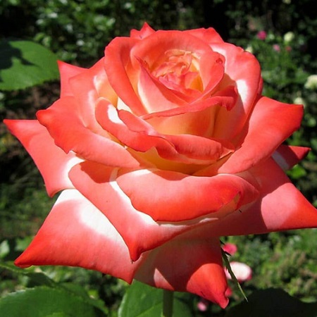 Чайно – гибридная роза .Цветение неоднократное и продолжительное со слабо выраженной волнообразностью. Аромат у этой розы тонок и едва чувствуется, но это с лихвой компенсируется высоким контрастом и сочетанием цветов бутона. Кусты прямостоячие, высотой до 70-100 см, листья крупные блестящие, обладают высокой устойчивостью к болезням. впечатляют крупные махровые цветы диаметром до 13 см .