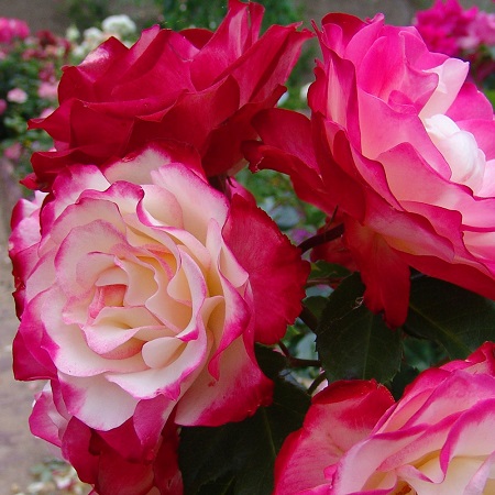 Окраска цветков розы ослепительно-яркая, меняющаяся по мере раскрытия цветка: вначале цветения лепестки белые с малиновыми краями, затем по мере раскрытия малиновый край расширяется, а интенсивность цвета усиливается до вишневого, заполняя собой большую часть лепестка. Наружная сторона лепестка чисто-белая. Замечательны также чашевидная форма крупных цветков (диаметр 10-12см) с высоким центром и их легкий фруктовый аромат. Цветение непрерывное, на протяжении всего летнего сезона, на кусте одновременно может быть до 25 цветков, которые не боятся дождя и держатся очень продолжительное время. Высота растения: 70-80см.Ширина: 60см.