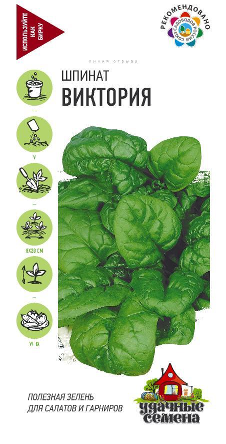 Раннеспелый (19-37 дней от полных всходов до уборки урожая) сорт. Розетка листьев прижатая, компактная, диаметром 14-19 см. Лист округлый, с ровным краем, длиной 8-10 см, шириной 6,5-7 см, темно-зеленый. Масса одного растения 25-28 г. Шпинат хорошо растет на плодородных обеспеченных влагой некислых почвах. Уход заключается в прореживание, регулярных поливах и прополке. Урожай собирают, срезая листовую розетку из 5-8 листьев. Урожайность 2,6-3,5 кг/м². Выращивают посевом в открытый грунт на глубину 2,3 см.