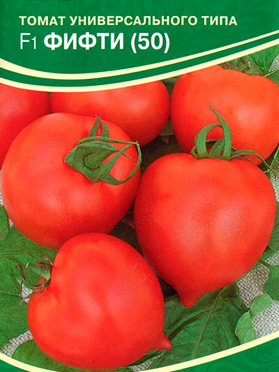 Фифти F1 - ранний детерминантный томат для выращивания в открытом и защищенном грунте. От всходов до созревания 95-100 дней. Растение мощное. В кисти 4-6 плодов. Плоды округлые с заострённой вершиной, многокамерные, гладкие, плотные, массой 140-150 г, красные, без зелёного пятна у плодоножки. Вкус отличный.